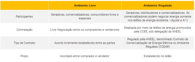 A comercialização de energia no Brasil é realizada em duas esferas de mercado: o Ambiente de Contratação Regulada (ACR) e o Ambiente de Contratação Livre (ACL). Entenda a diferença entre os dois ambientes no quadro comparativo: