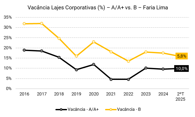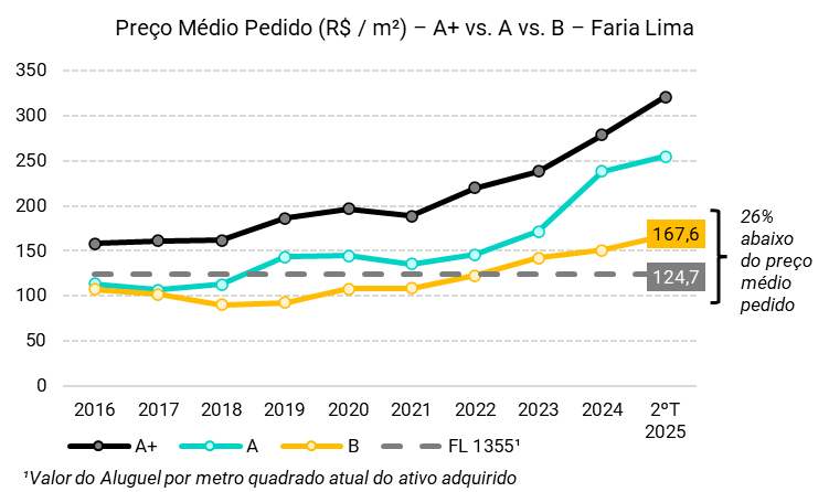 • Potencial de valorização: o aluguel da área adquirida está em torno de R$ 125/m², cerca de 26% abaixo do preço médio pedido para imóveis de padrão semelhante (classe B) na região. Diante dessa defasagem, do baixo nível de vacância na Faria Lima e do histórico positivo da gestão ativa da Tellus, há espaço para reajustes reais no valor de locação no médio prazo;