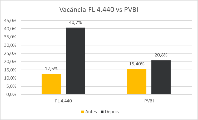 Em termos de impacto no resultado, considerando que o inquilino representa 11% da receita imobiliária do portfólio, sua saída deverá gerar um impacto negativo de aproximadamente R$ 0,07/cota sobre o resultado mensal do fundo, devido à redução da receita e ao custo de vacância. Além disso, projetamos que a vacância física do FL 4.440 aumente de 12,5% para 41%, enquanto a vacância total do portfólio deve subir de 15,4% para 20,8%, considerando as ocupações em andamento e a venda dos conjuntos do Vila Olímpia Corporate (VOC).