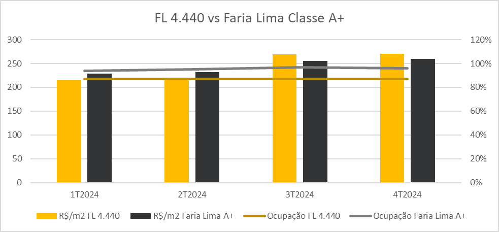 Apesar da saída do inquilino e dos possíveis impactos de curto prazo, acreditamos que o FL 4.440 possui atributos sólidos para superar a vacância atual, ainda que esse processo possa levar alguns meses. Isso porque o imóvel está localizado literalmente na Avenida Faria Lima, onde a taxa de ocupação para propriedades semelhantes é de 96%, e o valor médio de aluguel está praticamente alinhado com o praticado no edifício.