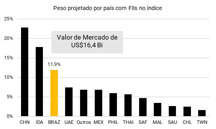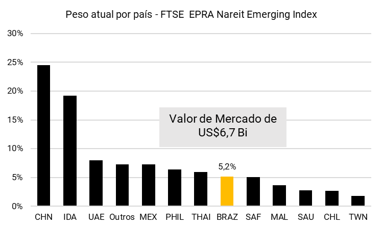 Além disso, embora o Brasil já integre índices internacionais como o FTSE EPRA Nareit Emerging Index, sua representatividade ainda é modesta. A capitalização de mercado dos FIIs brasileiros soma US$ 6,7 bilhões, o que equivale a apenas 5,2% do índice. Estimativas apontam que, com a inclusão plena dos FIIs, essa participação poderia chegar a aproximadamente 12% do total, ampliando significativamente o acesso da indústria ao capital global.