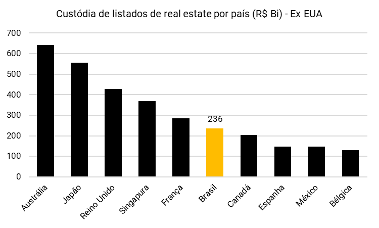 Em termos de ativos sob gestão, o Brasil já ocupa a sexta posição no ranking global de mercados de REITs (excluindo os EUA), superando países como Canadá, Espanha, México e Índia.