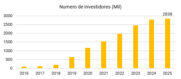 Esse avanço foi acompanhado por uma forte ampliação da base de investidores, que saltou de 89 mil para mais de 2,8 milhões no mesmo período — evidenciando o amadurecimento da classe no mercado de capitais e o crescente interesse dos brasileiros por produtos de renda passiva e acesso ao mercado imobiliário via bolsa.
