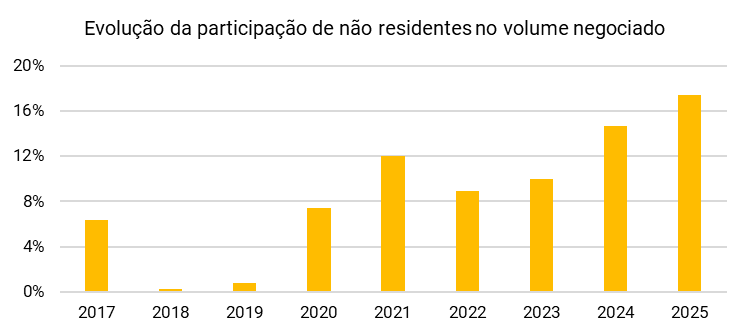 Embora a presença de capital internacional esteja em franca expansão — passando de 0,28% em 2018 para 17,4% em 2025 — ainda é considerada incipiente e distante do potencial da indústria. Para efeito de comparação, o mercado de ações brasileiro conta com mais de 60% de participação estrangeira.