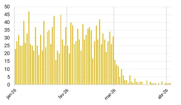 Assim, conforme ilustramos no gráfico abaixo, o tráfego de navios pelo local caiu cerca de 90% no mês de março, transformando a lógica do conflito de uma guerra militar para uma guerra logística e econômica Alguns países da região do golfo se viram obrigados a reduzir ou interromper a extração de petróleo, dada a incapacidade de escoamento da produção, enquanto países europeus e asiáticos dependentes da importação do petróleo da região começaram a adotar políticas de racionamento de combustíveis, alimentando os temores de que o conflito afete a atividade econômica global.