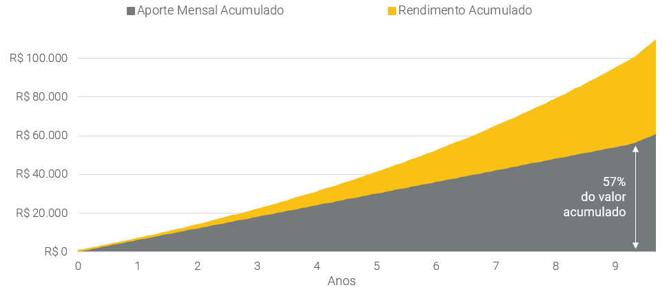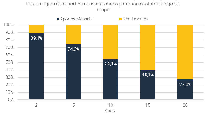 No exemplo acima, nos primeiros anos, antes da meta intermediária de R$100 mil ser alcançada, podemos perceber pelo gráfico que a parcela mais relevante do saldo acumulado é oriunda dos aportes mensais, ou seja, a disciplina de aportes é mais importante e relevante que os rendimentos gerados pelos investimentos. Ao atingir os R$100 mil, nesse exemplo, 57% do saldo acumulado veio dos aportes mensais.