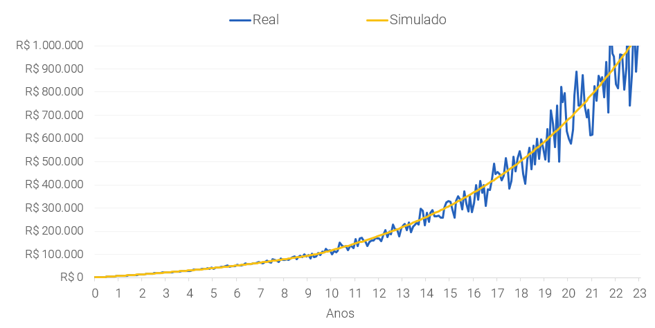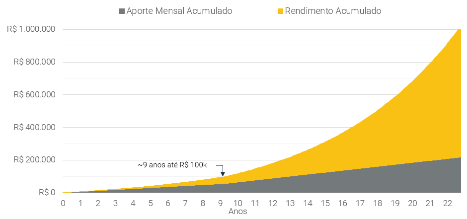 Essa dinâmica significa que, após atingir a marca dos R$100 mil, você estará na metade do caminho, ou seja, com mais alguns anos, nesse caso cerca de 10 a 11 anos, você terá alcançado um saldo de R$ 1 milhão.