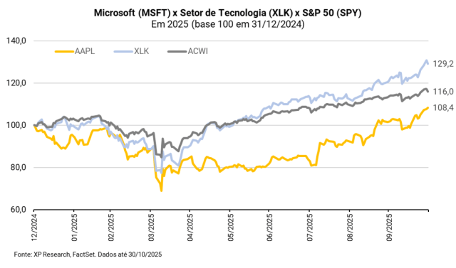 A Apple reportou resultados bons, com surpresas positivas na receita (+0,3%) e no lucro por ação (+4,3%). O trimestre foi sustentado pelo sólido desempenho do iPhone 17, cuja categoria cresceu 6% A/A, e pela expansão contínua da divisão de Serviços, que avançou 15% e atingiu US$ 28,75 bilhões em receita, ultrapassando a marca anual de US$ 100 bilhões pela primeira vez. A linha de Macs registrou alta de 13% A/A, iPads ficaram estáveis e a categoria de wearables e acessórios recuou levemente (-0,3%).