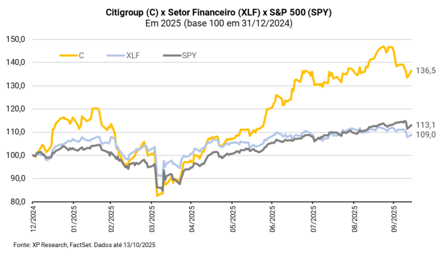 Segundo a CEO Jane Fraser, investimentos em novos produtos, ativos digitais e inteligência artificial vêm impulsionando a inovação e o desempenho consistente do banco. As ações do Citigroup acumulam alta de 36,5% em 2025, superando JPMorgan (+28,5%) e Wells Fargo (+12,4%), e se beneficiando da retomada de fusões e aquisições e da melhora das receitas com cartões de crédito. Mantemos perspectiva positiva para o Citi, que segue entregando resultados sólidos e acima das expectativas do mercado.