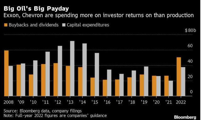 Grandes empresas petrolíferas não estão aumentando produção de petróleo apesar da demanda mais alta: O gráfico acima, da Bloomberg, mostra que as cinco maiores empresas petrolíferas do Ocidente juntas faturaram US$ 36,6 bilhões acima de seus gastos no primeiro trimestre, indicando que o lucro inesperado não está sendo investido em uma maior produção. Em vez disso, os executivos estão recompensando os acionistas com recompras de ações e dividendos. Os booms do petróleo normalmente desencadeiam uma busca por maior produção, mas desta vez todas as cinco supermajors mantiveram seus orçamentos de despesas de capital firmemente sob controle e prometeram que essa disciplina se manterá nos próximos anos, mesmo com a alta dos preços do petróleo desde que a Rússia invadiu a Ucrânia em fevereiro.