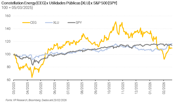 O principal destaque estratégico foi o fechamento da aquisição da Calpine, criando o maior produtor privado de energia dos EUA. A combinação une a maior frota nuclear do país com ativos relevantes de gás natural e energia geotérmica, fortalecendo a capacidade da Constellation de atender à crescente demanda por eletricidade, especialmente ligada a data centers e à economia de AI. Nesse contexto, a companhia firmou novos acordos com desenvolvedores de data centers, incluindo um contrato de 380 MW com a CyrusOne no Texas (com opção adicional de 380 MW).