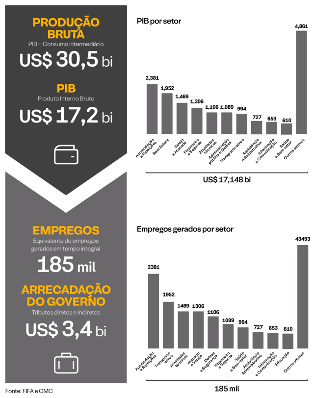 Em relatório da elaborado conjuntamente pela FIFA e OMC, estima-se que os gastos associados à Copa de 2026 terão impacto de US$ 17,2 bi sobre o PIB americano e US$ 40,9 para o PIB Global, e que a copa será responsável pela geração de 185 mil empregos (equivalente de empregos em tempo integral) nos EUA e 824 mil globalmente.