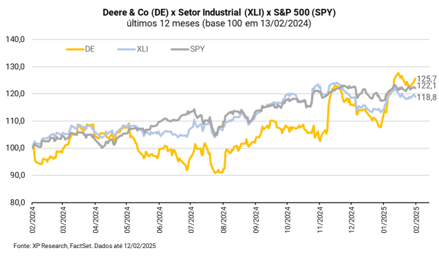 A Deere reiterou sua previsão de lucro para 2025, que deve estar na faixa de US$ 5,0 bi a US$ 5,5 bi. Porém, grande parte do mercado já considerava a previsão conservadora e esperava que tivesse alguma revisão positiva.