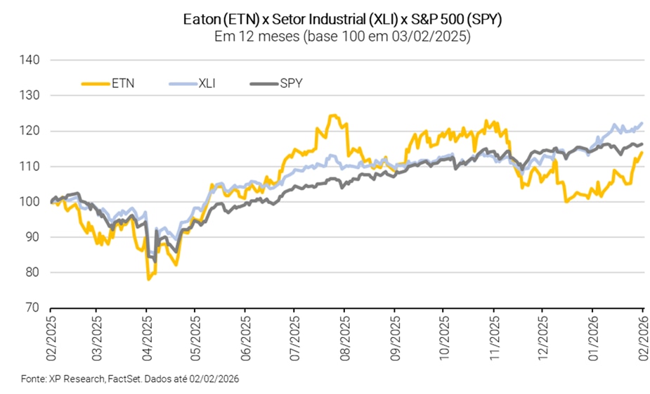 O CEO Paulo Ruiz identificou temas como digitalização, IA reindustrialização, gastos com infraestrutura e o crescimento nos mercados aeroespaciais como importantes vetores de crescimento para a Eaton, que apresentou crescimento robusto de encomendas (+16% em 12 meses) no 4T25.
