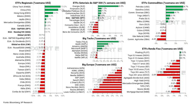 Na iminência da greve, ações de empresas de transporte marítimo tinham se valorizado na expectativa de preços de frete mais elevados, ante possível necessidade de rotas alternativas. Com a suspensão da paralização, ocorreu uma reversão do movimento. Maersk, grande expoente do setor, teve queda de -5,3% na semana, e foi acompanhada por pares globais.