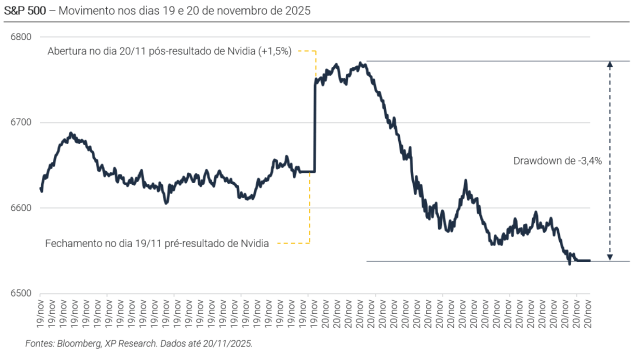 Sob a luz dos temas anteriores, vimos que a quinta-feira (20) tinha tudo para ser um dia positivo para os mercados globais. Nvidia havia reportado outro trimestre forte no dia anterior, Walmart tinha entregado um resultado sólido, puxado por ganhos de market share e aceleração em serviços de maior margem, e o tão aguardado payroll de setembro foi divulgado, com fortes números de criação de emprego. O S&P 500 chegou a subir 2% nas primeiras horas do dia, embalado pelas notícias que, em tese, dissipavam parte das incertezas que vinham do mercado. Porém, tudo que é bom dura pouco.