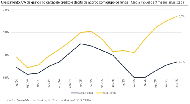 Nesse ambiente, Walmart e TJX têm se destacado. Ambas as varejistas conseguem capturar tanto o cliente pressionado, que troca marcas, posterga compras e maximiza cada dólar, quanto o cliente de renda mais alta, que busca maiores descontos por pura racionalidade econômica. O CFO da Walmart foi explícito ao dizer que a empresa vem ganhando participação em todas as faixas de renda, com destaque para as famílias de alta renda. Esse é um movimento que seria impensável em qualquer ambiente que não fosse marcado por esse “consenso do valor”. Já entre os consumidores de baixa renda, há sinais claros de fadiga, com retração mais visível no final do trimestre, impacto do hiato do programa alimentar SNAP durante o shutdown e, principalmente, um descolamento de salários que voltou a favorecer o topo da distribuição após anos em que o oposto ocorreu.