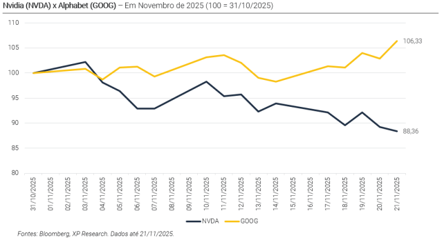 O resultado da Nvidia, portanto, mostrou duas verdades simultâneas: a demanda por IA segue forte e a empresa ainda opera com uma força difícil de replicar, mas não está sozinha em definir o ritmo da inovação tecnológica. O fato de Alphabet reforçar sua estratégia de silício próprio lembra ao mercado que os hyperscalers têm alternativas, e que a disputa pelo motor da AI pode se tornar mais diversificada do que parecia no início do ciclo. Essa tensão, com Nvidia em máxima potência e hyperscalers buscando autonomia ajudou a marcar o tom da semana, com alívio inicial, mas não o suficiente para ancorar o humor do mercado por muito tempo. No tema #5 uniremos todos esses pontos para tentar entender a dinâmica da semana.
