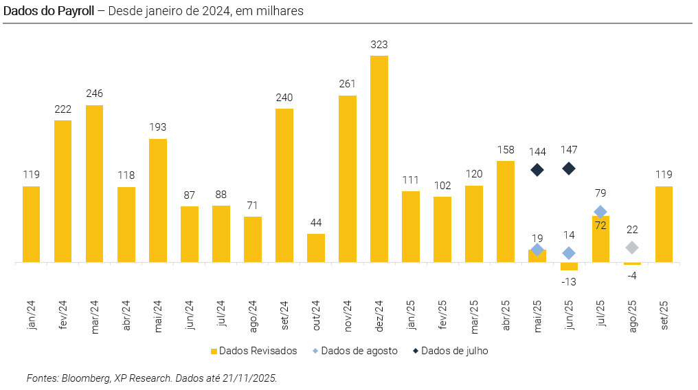 Os dados do payroll de setembro surpreenderam… e muito. A criação de 119 mil vagas de emprego no mês (vs. 51 mil esperados) interrompeu a sequência de dados mais fracos e trouxe um alívio após as revisões negativas vistas nos meses anteriores. Também foi divulgada uma taxa de desemprego levemente acima das expectativas, em 4,4%, mas o destaque do relatório continuou sendo o número de vagas criadas, que veio suficientemente forte para reorganizar as discussões sobre política monetária, especialmente porque o BLS não divulgará os dados de outubro devido ao impacto do shutdown sobre a coleta de dados, o que deixa o Federal Reserve com muito menos informação para decidir em dezembro.