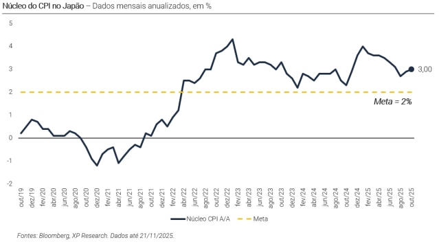 O Japão voltou ao centro do debate macroeconômico nesta semana, e não por um único fator, mas pela combinação entre inflação persistente, pressão por aperto monetário e um governo decidido a lançar um dos maiores pacotes de estímulos dos últimos anos. O dado da inflação de outubro levantou preocupações, com o núcleo avançando para 3,0% A/A, e levando o país ao 43° mês consecutivo acima da meta de 2%. Isso mantém vivo o debate sobre quando, e não mais “se”, o Banco do Japão (BOJ) precisará retomar o ciclo de alta de juros. O desafio, no entanto, é que esse aperto acontece em um momento em que a atividade já dá sinais de enfraquecimento, após o PIB cair 1,8% anualizado no trimestre.
