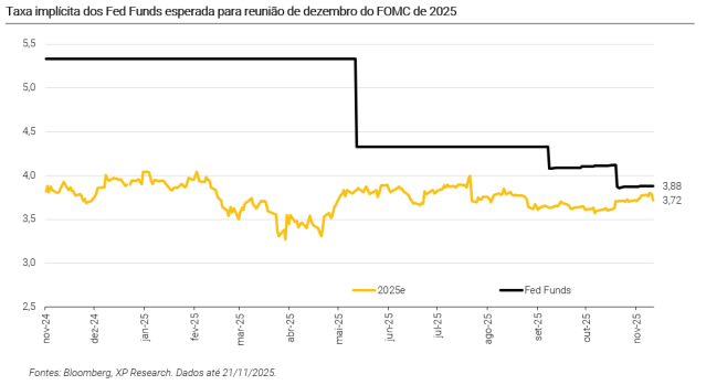 A partir disso, reabre-se a discussão sobre qual será a postura adotada pelo banco central americano: o mercado reagiu aos dados de mercado de trabalho com um aumento da expectativa de manutenção das taxas de juros em dezembro, após Powell já ter sinalizado que decisões futuras dependeriam da evolução dos dados econômicos. Agora, diante de uma recuperação do emprego e com a lacuna estatística criada pelo shutdown, ainda existe a dúvida se o Comitê se sentirá confortável em cortar diante do hiato de informações críticas. Powell também já havia citado que parte da desaceleração aparente do emprego poderia estar sendo superestimada, e essa visão foi reforçada pero rebound nos últimos dados, que ajuda a mitigar preocupações sobre oferta de mão de obra.