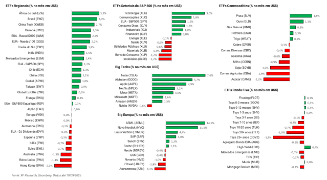 O Federal Reserve, banco central americano, decidiu cortar a taxa dos Fed Funds em 25 bps, para o intervalo entre 4,0% e 4,25%. O movimento de retomada do ciclo de afrouxamento monetário nos EUA era amplamente aguardado após discurso do presidente da instituição, Jerome Powell, no simpósio de Jackson Hole, que destacou o efeito da deterioração do emprego sobre o balanço de riscos do Fed, superando riscos de aceleração da inflação motivada por tarifas. Em dezembro de 2024, a autoridade monetária havia interrompido o ciclo de cortes diante da persistência da inflação e resiliência da atividade econômica.