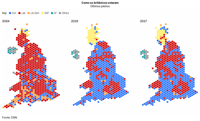 As eleições, realizadas na quinta-feira, conferiram vitória ao Partido Trabalhista, conforme esperado. O partido, entretanto, conquistou menos assentos que o projetado, e formou uma maioria de 412 na Câmara dos Comuns, contra 121 dos Conservadores (a ex primeira-ministra Liz Truss, que permaneceu no cargo por apenas 45 dias, perdeu seu assento). O líder dos Trabalhistas, Keir Starmer, se tornou primeiro-ministro.