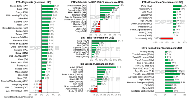 O crescimento das plataforma globais de e-commerce chinesas está mudando o padrão de compras do consumidor global e isso não acontece sem consequências. Indústrias e governos locais buscam se adaptar (ou lutar contra) à avalanche de produtos “Made in China”. O volume de mercadorias é tão grande que, inclusive, já afeta as cadeias de suprimentos e faz os preços dos fretes subirem até 40% no comparativo anual, em especial nas rotas aéreas originadas no sul da China, de onde partem a maior parte dos produtos de Shein e Temu. Ações da PDD Holdings (dona do Temu, que faz parte da nossa carteira Top Ações Globais XP) subiram 2,4% na semana e a Shein não é listada, embora tenha planos de fazer IPO na bolsa de Londres este ano.