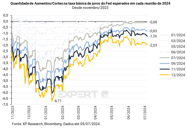A XP acredita que o Fed reduzirá os juros pela primeira vez em dezembro. No entanto, considerando a situação atual da economia e os novos dados, crescem as chances de um corte nos juros mais cedo, em setembro. O mercado atribui 85% de chances de um corte de juros até setembro, e espera que a taxa dos Fed Funds seja cortada em 51 bps até o final de 2024.