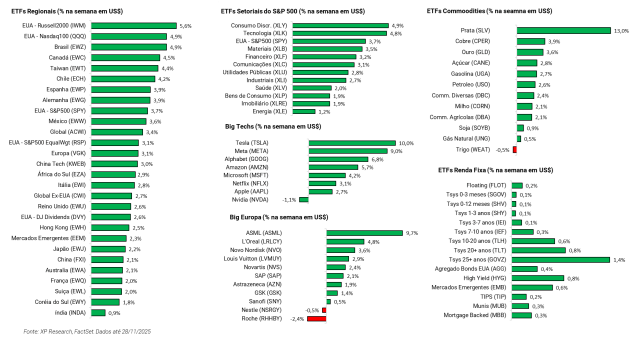 Diante das notícias da semana e expectativas para a próxima reunião do Fed, a curva de juros fechou durante a semana, com as taxas de 2 anos e 10 anos recuando -1 bp e -4,6 bps, respectivamente. Segundo o CME Fed Watch, o mercado atribui 87% de chance de um corte de 25 bps na próxima semana.