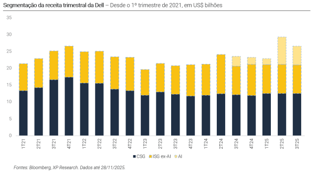 A Dell segue ocupando um espaço estratégico no boom da inteligência artificial, já que ao mesmo tempo que não disputa os holofotes por modelos de AI, tornou-se uma das peças centrais na infraestrutura que permite que tudo aconteça. O resultado do trimestre forçou exatamente isso. Mesmo com uma receita levemente abaixo das expectativas, a mensagem central foi de aceleração, com as encomendas de servidores para AI somando US$ 12,3 bilhões no trimestre e passando de US$ 30 bilhões no ano. Isso tem consolidado a companhia como a “engenheira” por trás de uma nova geração de data centers, responsável por integrar, empacotar e entregar clusters gigantescos com GPUs Nvidia.