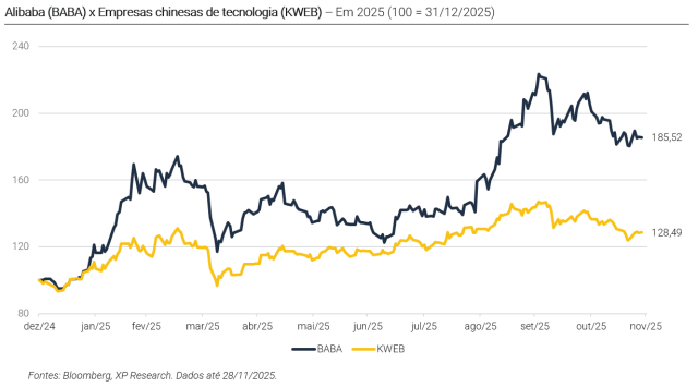 Não tem como falar de tecnologia e inteligência artificial na China sem falar de Alibaba, que divulgou seus resultados trimestrais durante a semana. Já está claro que o superciclo da AI está reconfigurando a economia chinesa, e os números do 3T25 da Alibaba ilustraram bem essa dinâmica. A receita da companhia cresceu de forma sólida, porém o lucro foi pressionado pela combinação de competição em segmentos de varejo e, principalmente, investimentos agressivos em infraestrutura de AI, que reduziu o lucro pela metade. No entanto, o foco do mercado também está em computação na nuvem, que no caso da Alibaba acelerou +34% A/A, sustentado pela demanda intensa por serviços de AI e pelo nono trimestre consecutivo em que o crescimento em produtos do segmento atingiu três dígitos.