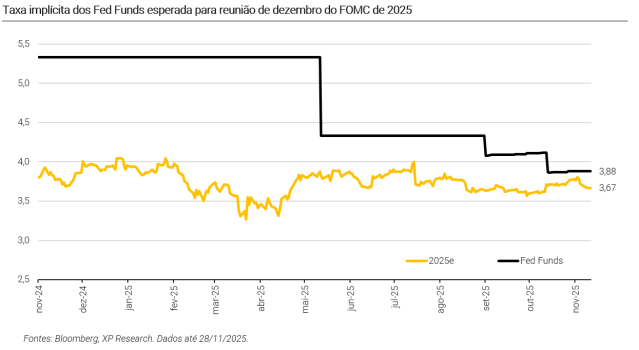 O Beige Book, um dos documentos oficiais do Fed mais importantes para entender a economia americana em tempo real, reforçou essa leitura mais suave. O relatório descreveu um mercado de trabalho que esfria mais rapidamente do que a inflação piora, sugerindo que o balanço de riscos está migrando na direção de menor atividade. Além disso, boa parte das pressões de preços atuais decorre de tarifas, que o Fed historicamente olha de maneira diferente por não refletir excesso de demanda doméstica. Assim, essa combinação abriu espaço para falas dovish de dirigentes importantes, como Mary Daly e Chistopher Waller.