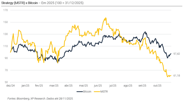Nesse cenário, mais um risco surgiu. O MSCI estuda remover de seus índices empresas cujo patrimônio seja majoritariamente digital. Se confirmado em janeiro, é estimado que até US$ 2,8 bilhões de capital passivo da Strategy sejam vendidos, o que amplificaria uma queda das ações, que que já acumula mais de 50% em três meses, acompanhando uma queda da criptomoeda subjacente: o bitcoin já cai -16% no período. Para uma empresa que carrega 650 mil bitcoins, o suficiente para mover mercados sozinha, essa pressão técnica pode se tornar bem crítica. Em 2022, Saylor dizia explicitamente que a empresa funcionava como um ETF de bitcoin, porém hoje defende que não deveria ser tratada como tal…