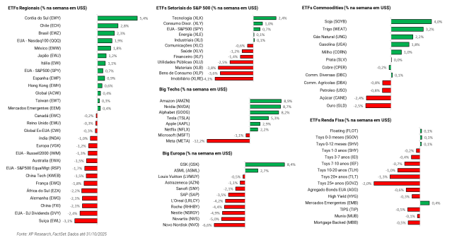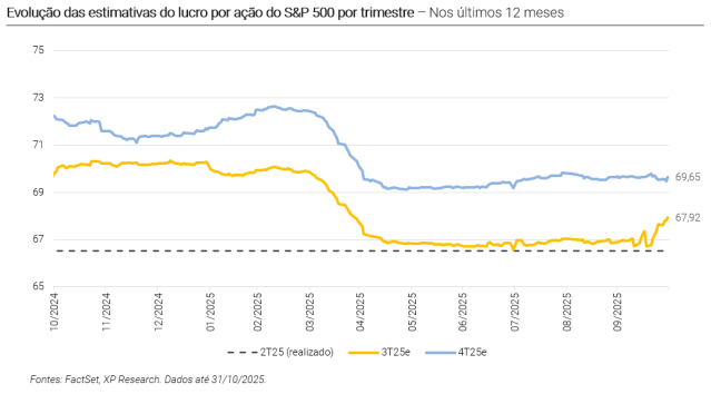 Essa semana foi uma das mais importantes para a temporada de resultados do 3T25, com mais de 40% da capitalização de mercado do S&P 500 reportando seus números. Além das Big Techs (tema #3) e das companhias do setor de saúde (tema #5), pudemos entender um pouco mais do retrato de outros setores a partir dos números da semana.
