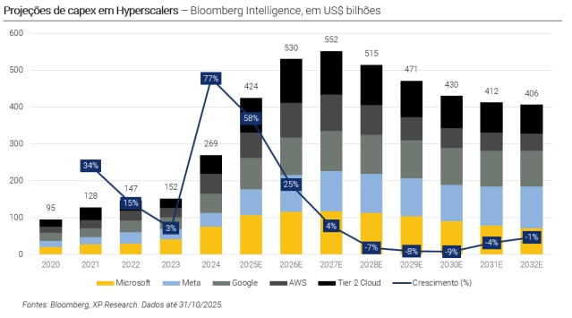 Com série de resultados divulgados ao longo da semana, as Big Techs seguem dominando o noticiário com uma combinação de resultados sólidos e gastos cada vez mais agressivos em inteligência artificial. Microsoft, Alphabet, Amazon, Meta e Apple superaram as estimativas de receita e lucro, impulsionadas pelo avanço da nuvem e pelo investimento massivo em data centers e infraestrutura. A nova rodada de resultados confirmou o que o mercado já pressentia: o clico de capex em AI está longe de desacelerar. O problema é que, agora, o entusiasmo começa a dividir espaço com a cobrança por resultados tangíveis e, caso o mercado simplesmente comece a perder a fé na capacidade das empresas em converter investimentos em retorno rapidamente, o resultado pode ser uma das maiores liquidações da história do S&P 500.