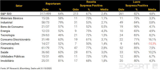 - Receita: 64% de surpresas positivas com média de +2,4% (semana anterior: 70%/2,4%)