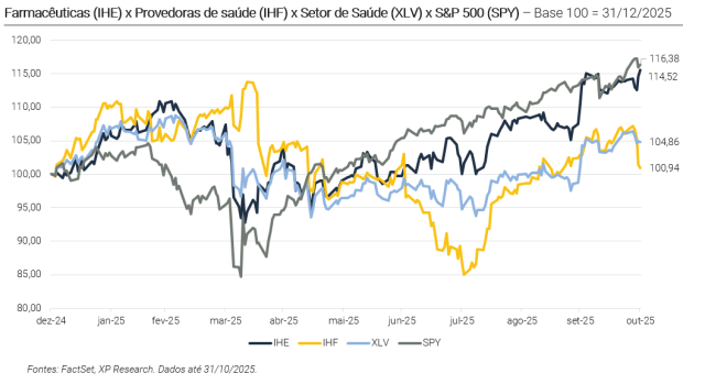 Porém, o ambiente ainda é de pressão de custos, e esse segue como o tema central do setor. Seguradoras continuam lidando com utilização elevada em Medicare Advantage e Medicaid, além de um ciclo de reajustes ainda aquém da inflação médica em vários estados. A própria United Health indicou aumentos médios acima de 25% nas taxas dos planos ACA (Affordable Care Act, lei que regula e subsidia o acesso ao seguro-saúde individual nos EUA) e redução de área de cobertura onde não houver acordos sustentáveis, esperando queda de aproximadamente 2/3 na base ACA. Assim, as ações do subsetor vêm apresentando desempenho inferior ao do S&P 500 nos últimos meses, refletindo custos persistentes e incertezas políticas que afetam subsídios e precificação.