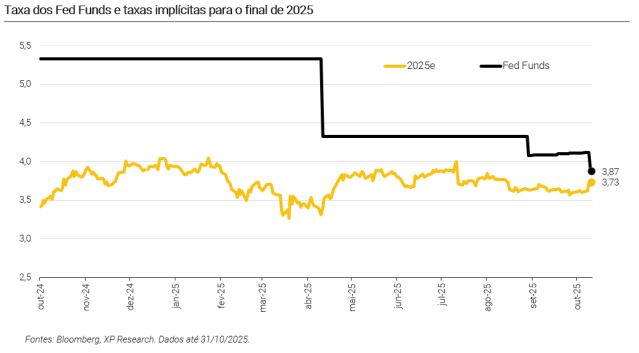 Em linha com o esperado, o Federal Reserve (Fed, banco central dos Estados Unidos) cortou a taxa dos Fed Funds em 0,25 p.p. e anunciou, para o início de dezembro, o fim do Quantitative Tightening (processo que diminui o volume de reservas em circulação e, portanto, é uma ferramenta de política monetária contracionista). No entanto, o tom mais duro de Jerome Powell, presidente do Fed, pegou o mercado de surpresa, com a sinalização de que há grande divergência entre membros do FOMC (Comitê Federal de Mercado Aberto) sobre os rumos para a próxima reunião de política monetária, que ocorrerá em dezembro, decisão que “está em aberto”.