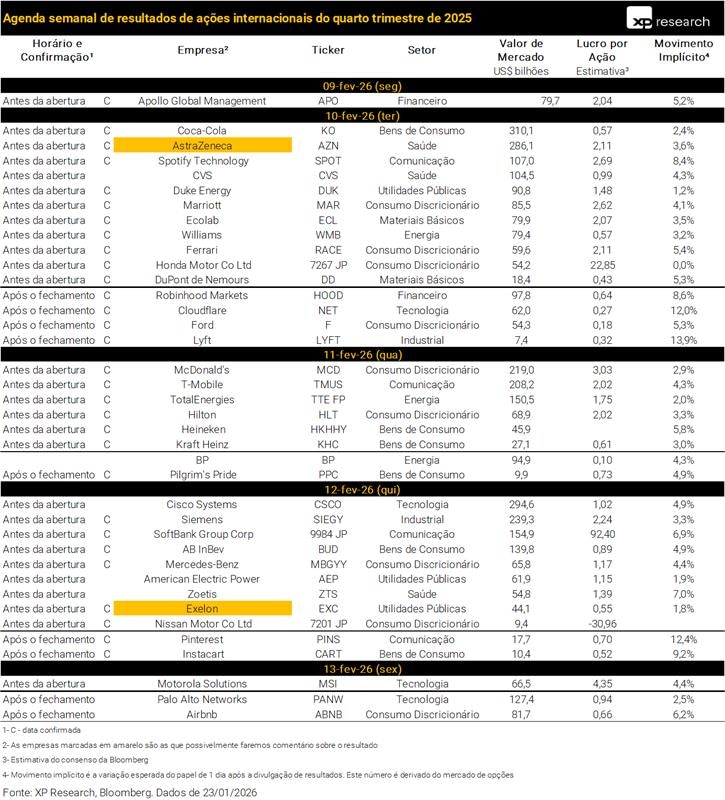 Mais de metade das empresas do S&P 500 divulgaram resultados para o 4T25, e até agora, os números apontam para superação das expectativas agregadas de crescimento de lucro. Nessa semana, as Big Techs seguiram em evidência, após a divulgação dos resultados de Alphabet e Amazon. A reação dos mercados mostrou que, mesmo em meio a receitas robustas e forte demanda por soluções de AI, investidores estão cada vez mais sensíveis ao impacto de capex recorde nas margens e no retorno de capital de longo prazo.