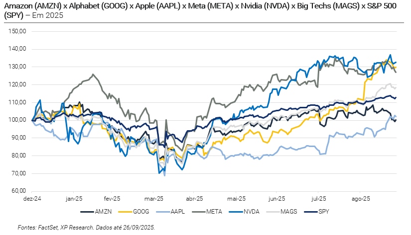 No caso de Alibaba (ticker: BABA), o gatilho foi um pacote robusto: parceria com a Nvidia, expansão global de data centers e a estreia do Qwen3-Max, LLM com mais de 1 trilhão de parâmetros. Eddie Wu, CEO da companhia, reforçou que AI é prioridade estratégica e que o capex vai além dos 380 bilhões de yuans (US$ 53 bi) já anunciados para três anos. A empresa anunciou abrirá data centers no Brasil, França e Holanda (e prepara México, Japão, Coreia, Malásia e Dubai), posicionando a Alibaba Cloud como “full-stack AI provider”, indo desde a capacidade de processamento aos modelos de AI. O mercado se animou com as notícias, fazendo as ações subirem +5,6% durante a semana.