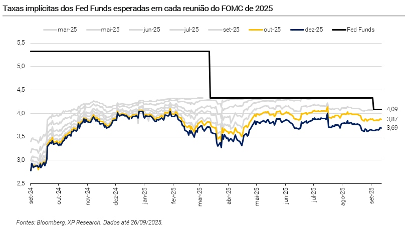 À luz de todos os dados e notícias da semana, a curva de juros abriu, com avanços de +6,5 bps e +4,4 bps nas taxas de 2 e 10 anos, respectivamente. A precificação na curva contempla a previsão do mercado de cerca de 1,6 cortes até o final de 2025 e mais aproximadamente 2,3 cortes em 2026, com probabilidade de 89,8% de mais um corte em outubro.
