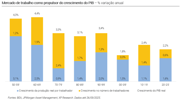 A decisão sobre o H-1B sucede uma série de políticas que inicialmente impactaram migrantes de renda mais baixa, e já provocam impactos no equilíbrio do mercado de trabalho americano, com efeitos como a redução do payroll (criação de novos empregos) de “equilíbrio” e inflação salarial. Diante de uma queda disseminada na taxa de fecundidade entre os países desenvolvidos, os Estados Unidos ocupavam uma posição de exceção ao conseguir impulsionar seu potencial de crescimento econômico ao suprir um fluxo constante de migrantes para mitigar o impacto do eventual declínio populacional. Isso é relevante uma vez que em última instância, podemos atribuir o potencial crescimento econômico de longo prazo ao crescimento populacional e ganho de produtividade.