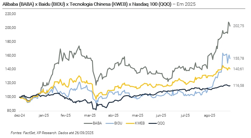 As notícias da semana reforçam duas teses complementares, e contribuem para o rali de ações de tecnologia chinesa no mês em que se completa um ano desde o anúncio do pacote de estímulos governamentais que precedeu a virada de ciclo das bolsas chinesas e impulsionou a atual corrida local por inteligência artificial. Alibaba agora quer ser plataforma global de infraestrutura e modelos, com a ajuda de parceiros “campeões mundiais” em hardware. Baidu, por sua vez, acelera o go-to-market de casos de uso tangíveis (robotáxis) enquanto verticaliza componentes críticos. Para o investidor, a leitura é que o “AI trade” na China não se limita a ideias: temos capex, produtos e licenças saindo do papel.