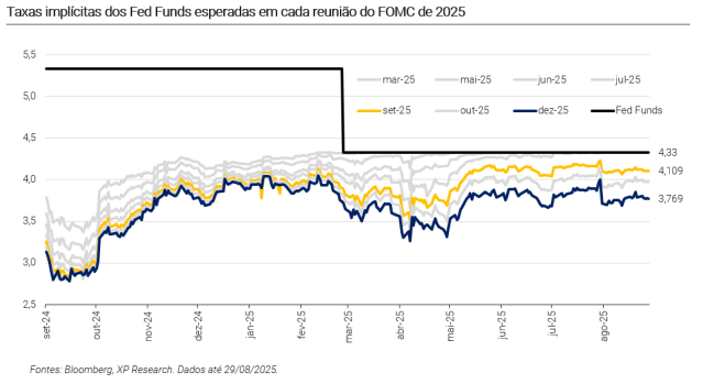 Os dados do PCE, medida de inflação preferida pelo Fed, foram divulgados no início da sexta-feira e não trouxeram grandes surpresas. Os números vieram alinhados com as expectativas, registrando alta de 0,2% no mês e 2,6% A/A, enquanto o núcleo do PCE acelerou levemente para 2,9% A/A. Os dados se somam à inflação ao consumidor (CPI) de julho, divulgados na semana retrasada, que vieram levemente abaixo do esperado, mas com a composição do dado acendendo sinal de alerta. Assim como no CPI, o PCE indicou que os preços de serviços aceleraram, sendo esse um componente menos sensível a tarifas e com maior persistência inflacionária.