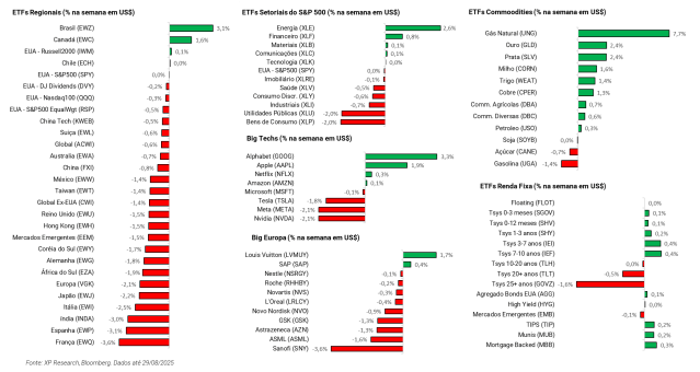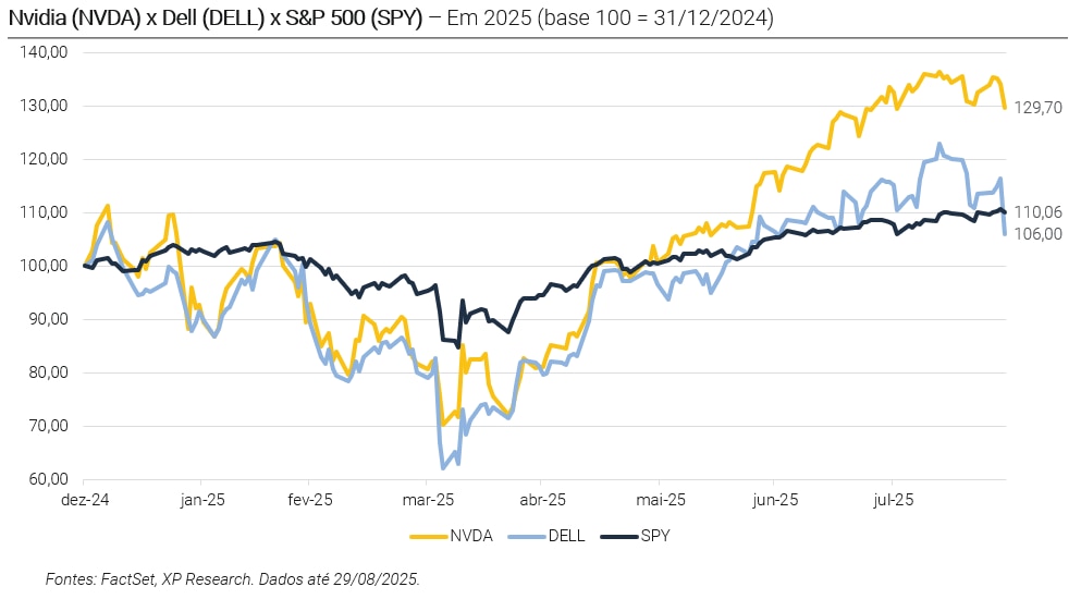 Na última semana de agosto, o foco do mercado esteve nos resultados da Nvidia referentes ao 2T25. A companhia entregou números sólidos, com surpresas positivas tanto na receita (+1,1%) quanto no lucro por ação (+3,5%). O segmento de Data Centers, que responde por 87,7% da receita total, apresentou leve surpresa negativa de -0,5%, embora ainda tenha registrado forte expansão de +56,4% A/A. Além disso, o guidance para o próximo trimestre veio acima das expectativas, com o ponto médio da margem bruta 10 bps superior ao consenso e receita projetada +1% acima. Apesar disso, a magnitude da surpresa reforçou receios sobre a sustentabilidade do atual ritmo de investimentos em inteligência artificial. As ações recuaram -3,3% na semana.