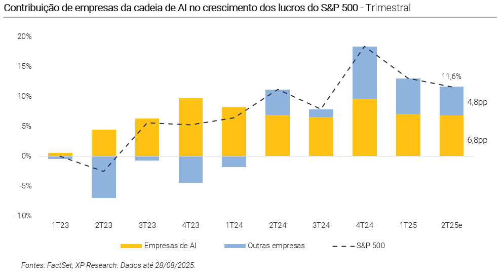 Por fim, vimos que as empresas ligadas a inteligência artificial seguiram influenciando positivamente os resultados do 2T25. Os números foram impulsionados pela continuidade de crescimento da demanda por soluções relacionadas à temática. As principais empresas de AI contribuíram com +6,8pp para o crescimento de +11,6% do S&P 500.