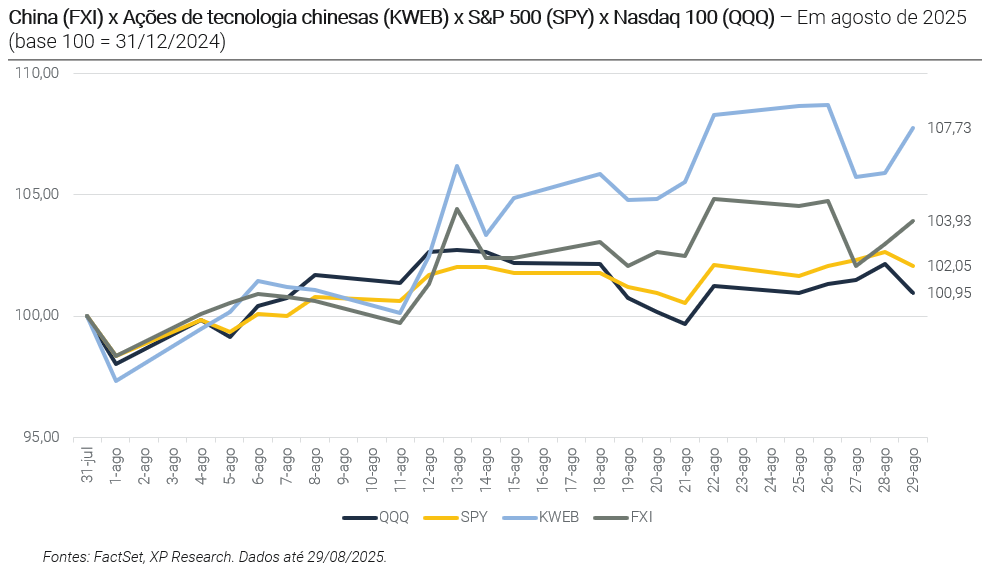 A semana foi movimentada na China, com o mercado reagindo a uma série de eventos locais. As expectativas por novos estímulos econômicos voltaram a ganhar força, impulsionadas por medidas voltadas ao setor imobiliário em cidades como Xangai. Além disso, a deslistagem da gigante Evergrande, um marco simbólico na crise do setor, reacendeu o debate sobre a capacidade do governo de conduzir um crash controlado. Para completar, a Alibaba divulgou seus resultados trimestrais, acompanhados de uma forte aposta em chips de AI desenvolvidos internamente.