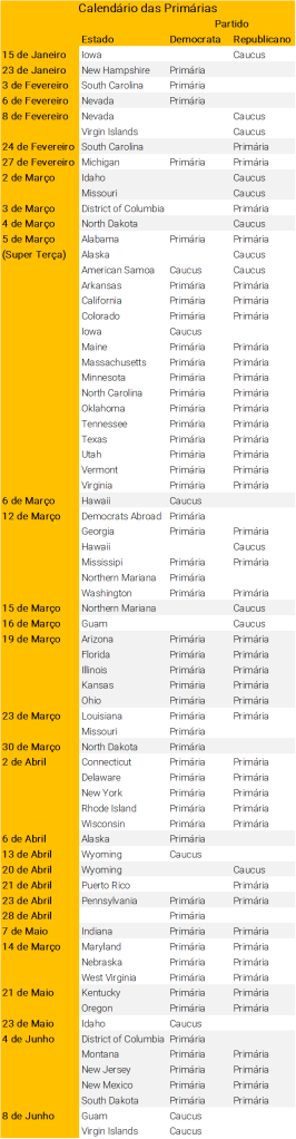Superdelegados: Para além dos delegados escolhidos em primárias e caucuses, ainda existem os superdelegados, que são nomeados automaticamente de acordo com as regras de cada partido, e que têm o poder de votar na convenção independentemente dos resultados das primárias e caucuses. Os superdelegados democratas são mais numerosos que os republicanos, mas não poderão votar na primeira rodada em uma convenção contestada. Já entre os republicanos, a proporção de superdelegados é menor, tendo menos peso.