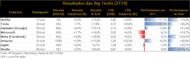 Como comentamos acima, no 3T24 as ações das Big Techs foram responsáveis por uma contribuição menor para o lucro por ação do S&P 500. Apesar disso, a temporada foi de surpresas positivas em todas as 8 empresas, porém as reações do mercado foram mistas, refletindo preocupações com redução na magnitude das surpresas e desaceleração no crescimento interanual (que afetou particularmente Nvidia e Apple).